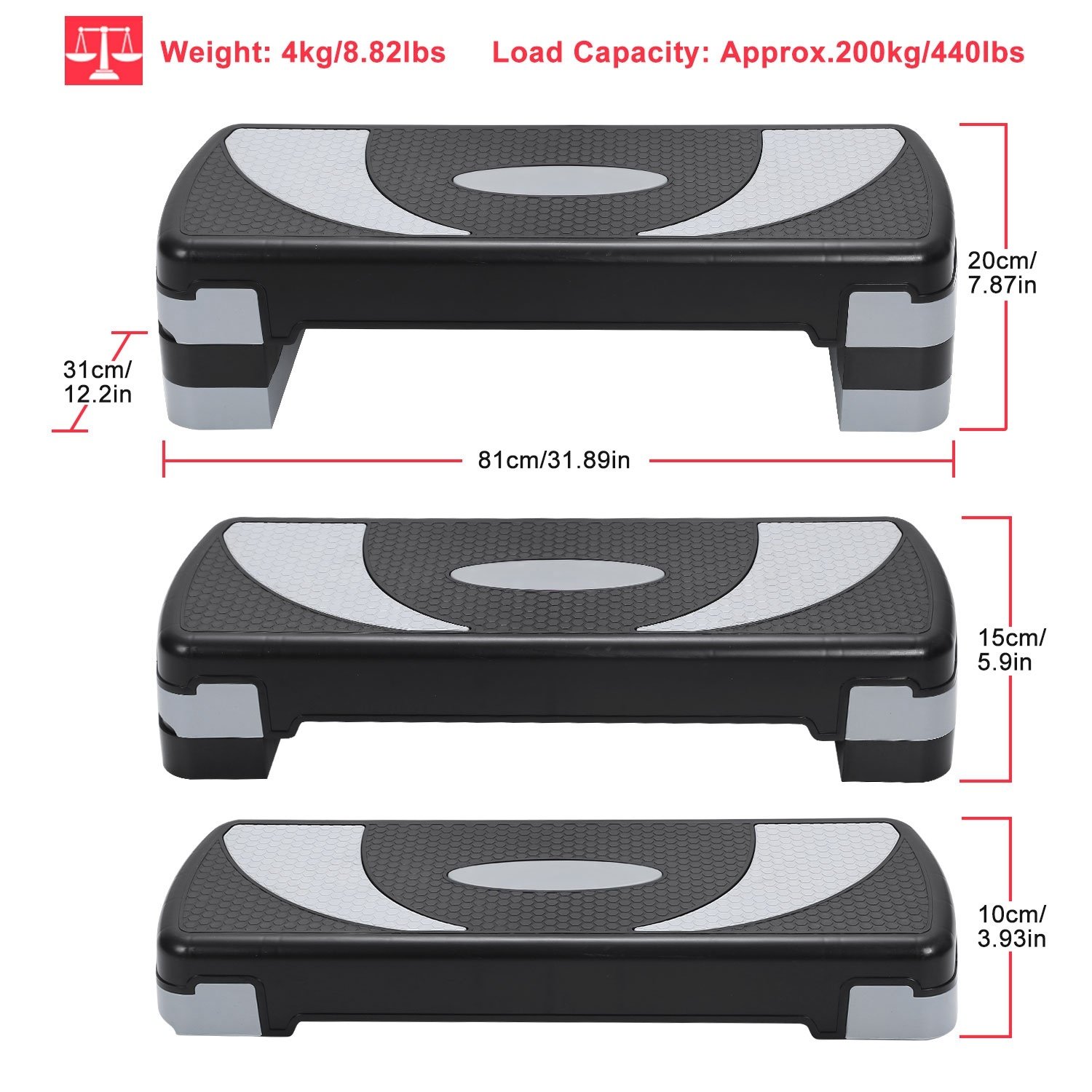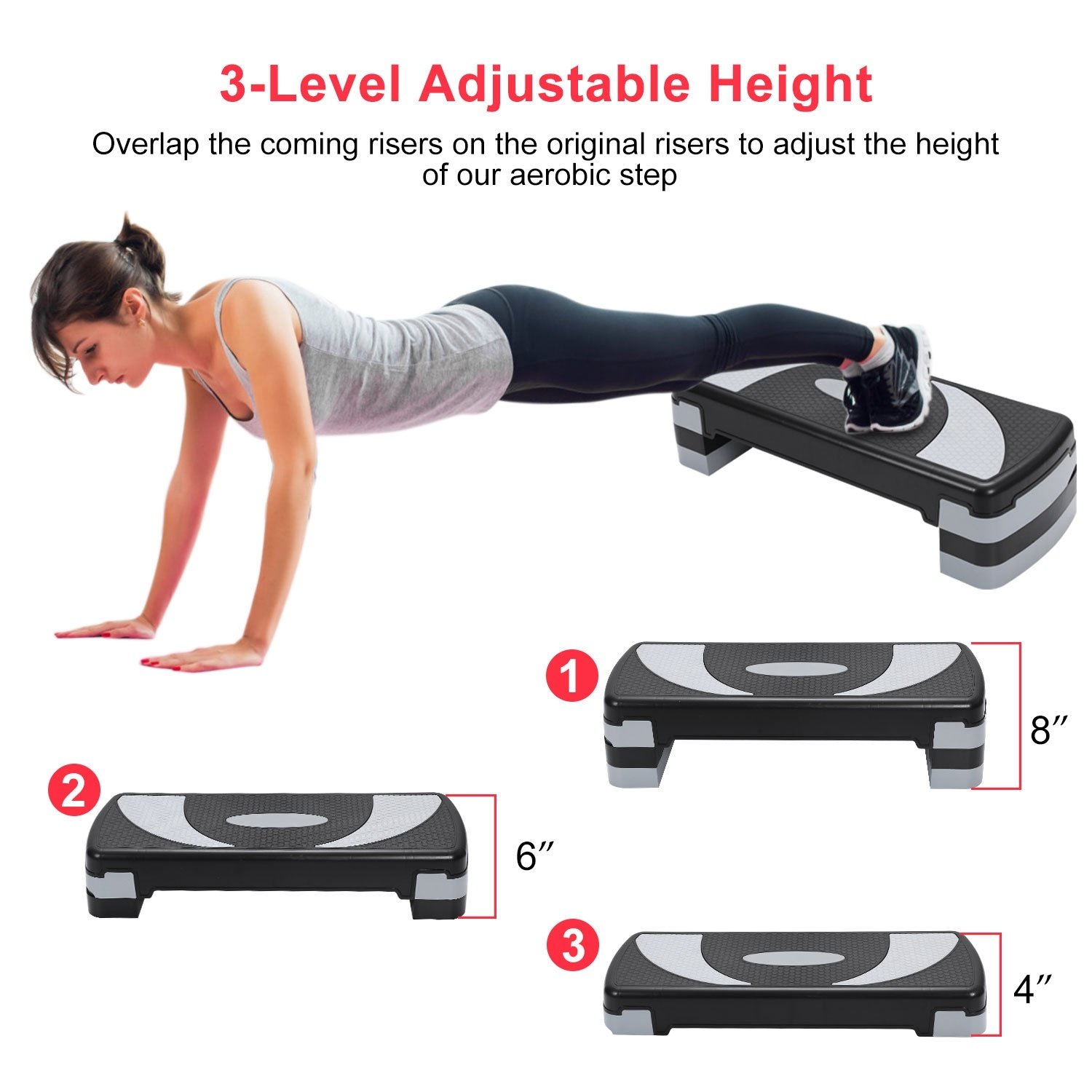 **3-LEVEL ADJUSTABLE HEIGHT SETTINGS*:Just overlap the coming risers on the original risers to adjust the height of our aerobic step(4inches,6inches and 8inches) and meet your different workout needs.