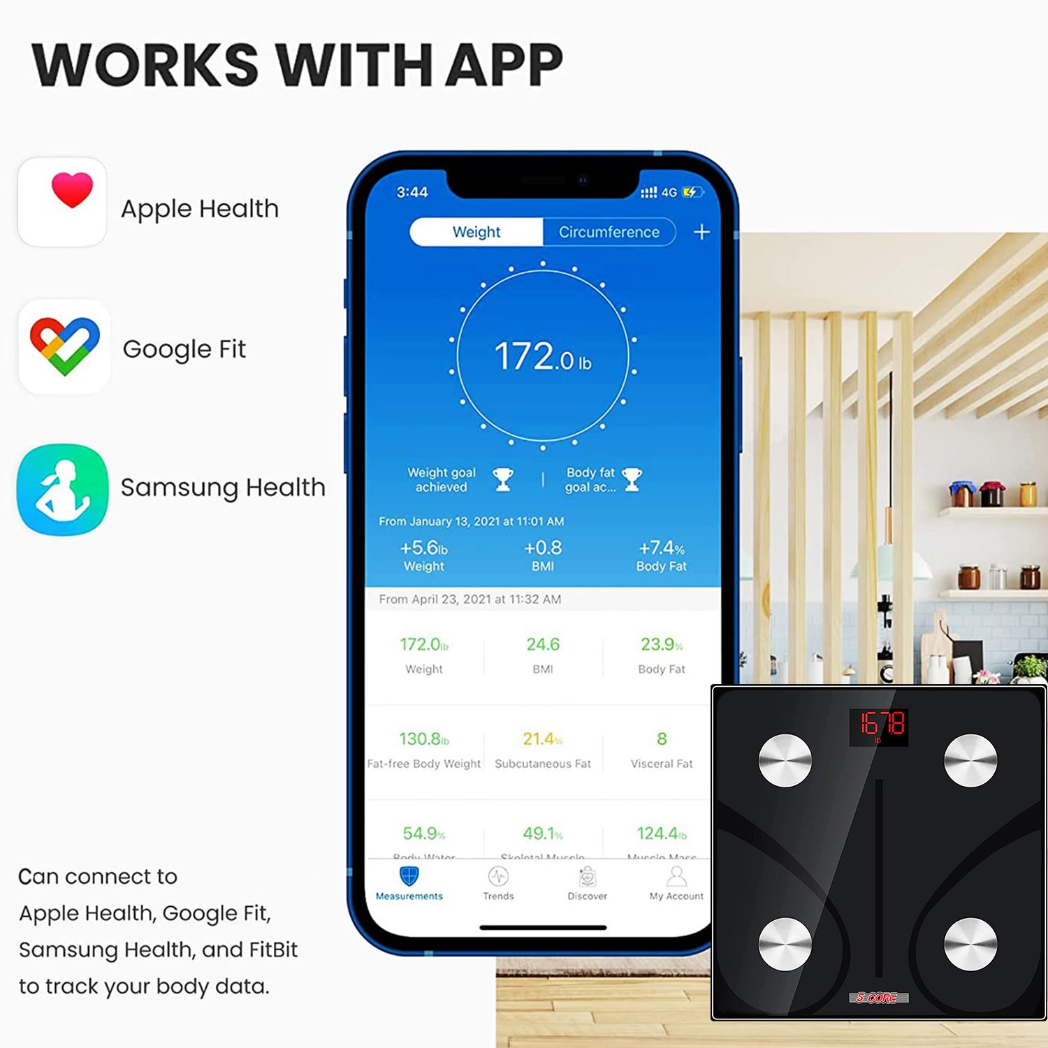 1.Smart Scale for Body Weight connects with health apps like Fitbit, Google Fit, Samsung, Apple Health