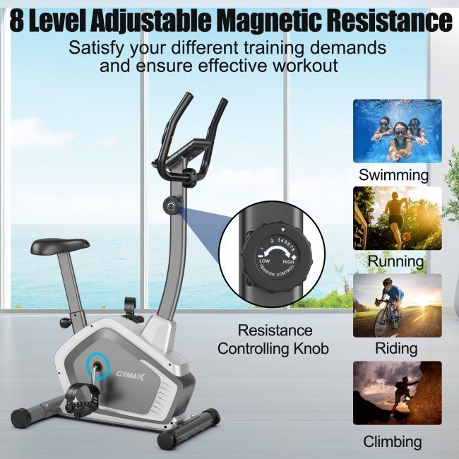 Adjustable Magnetic Resistance: There are 8 levels of magnetic resistance for you to choose from. Whether you want to do a cardio workout or muscle building, the upright bike will always satisfy your training needs. Just switch the resistance controlling knob beneath the handlebars and then you can achieve the training intensity you want.
