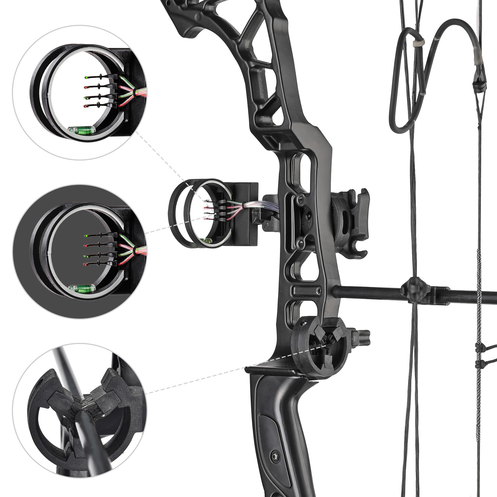 - Higher Aiming Accuracy - 4-pin sight installed for precise aiming, help you react quickly to a moving target, fiber optics reflect ambient light making it easy to see in low light, bubble level for leveling accuracy; Brush capture arrow rest offers clear view to the entire arrow & tip and reduces friction