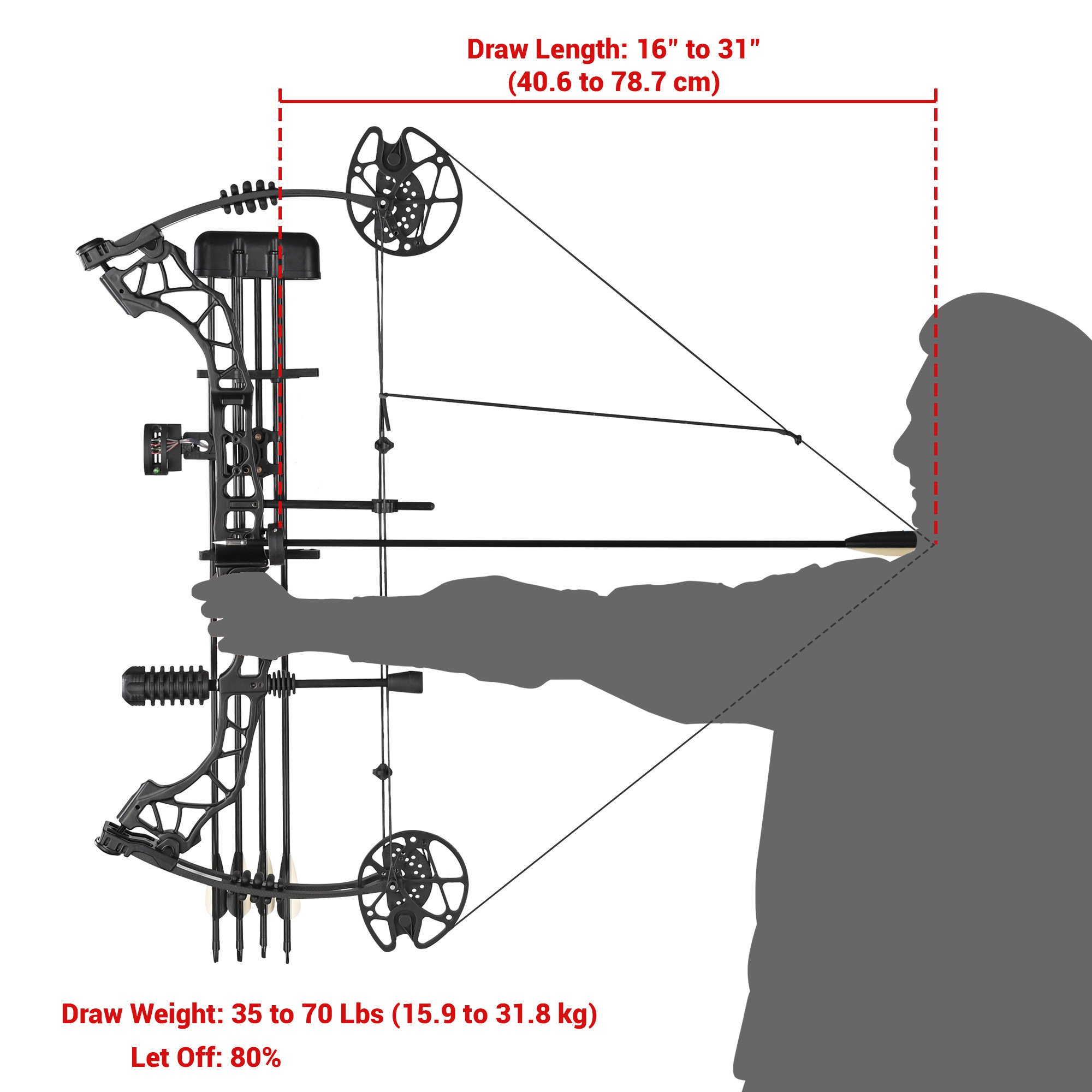 - Adjustable Draw Length & Weight - 35 to 70 Lbs draw weight and draw length from 16" to 31" for customized adjustment according to arm span, which works well with most adults; 80% let-off meaning less force applied to the string at full draw & more time to aim