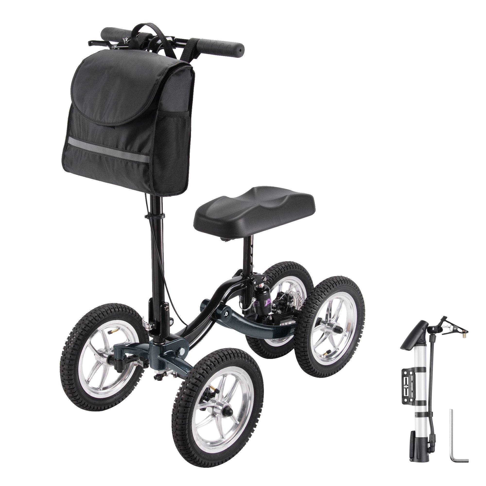 - All-terrain &   Multifunctional - This All-Terrain Knee Walker comes with 12" pneumatic   tires and an air pump, along with a shock absorber for additional buffer and   smooth running when passing through rough surfaces like pavements, grassland,   gravel and rugged roads; an effective alternative to crutches for the elderly   and patients recovering from leg injuries