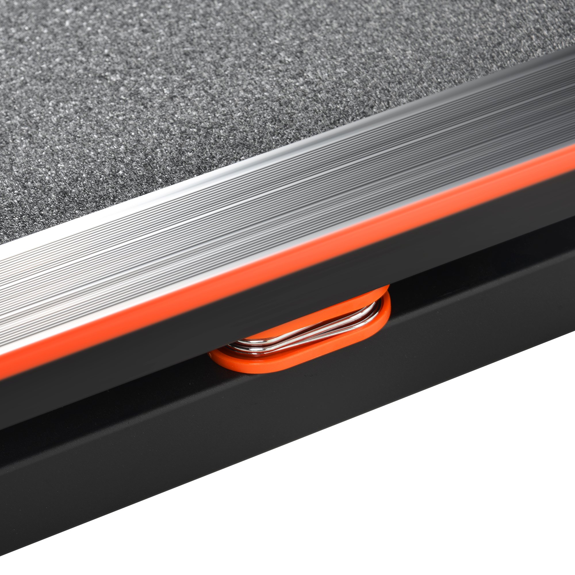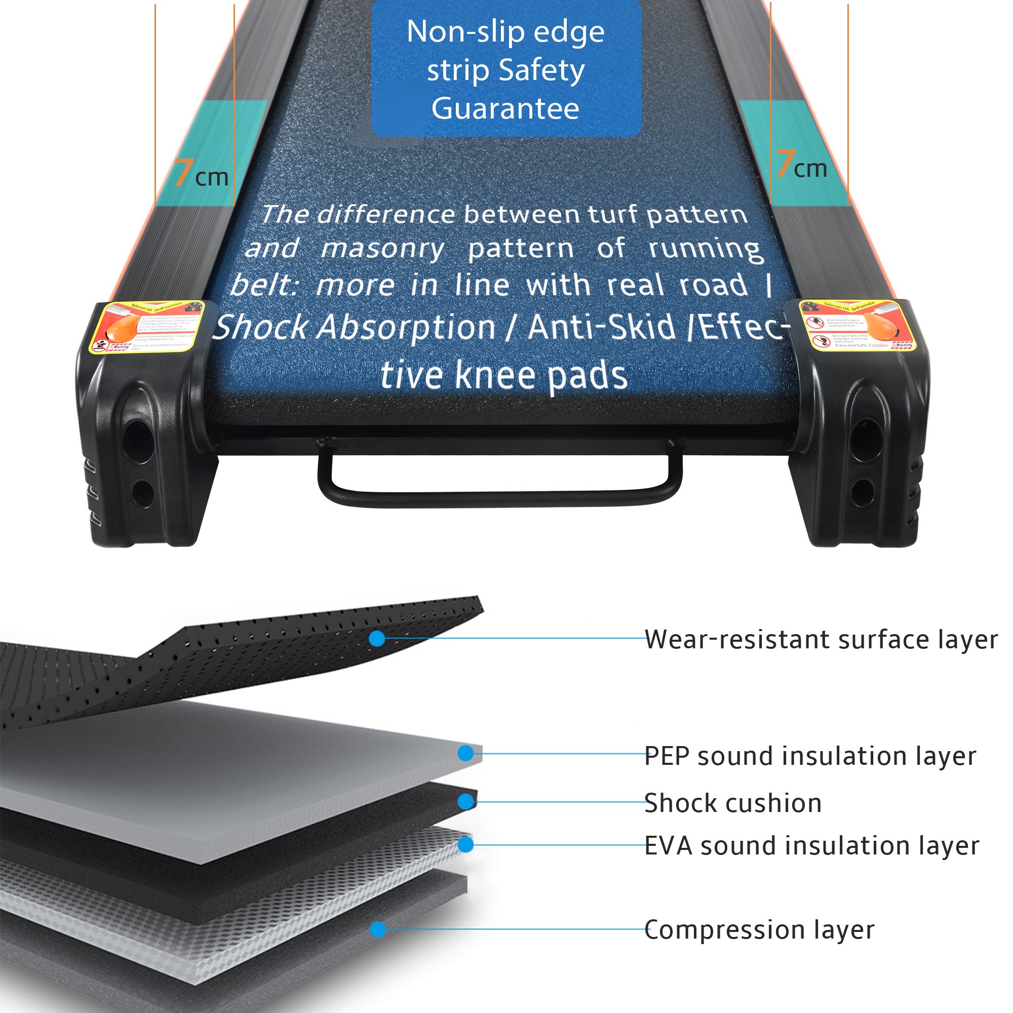 [Foldable design & Cushioning Design]Easy folding mechanism and a soft drop system to help you fold and unfold your treadmill safely and with ease. This treadmill also feature with 6 silicone pads, 3 on each side of the machine, which can reduce noise and descrease vibration to your floor efficiently.