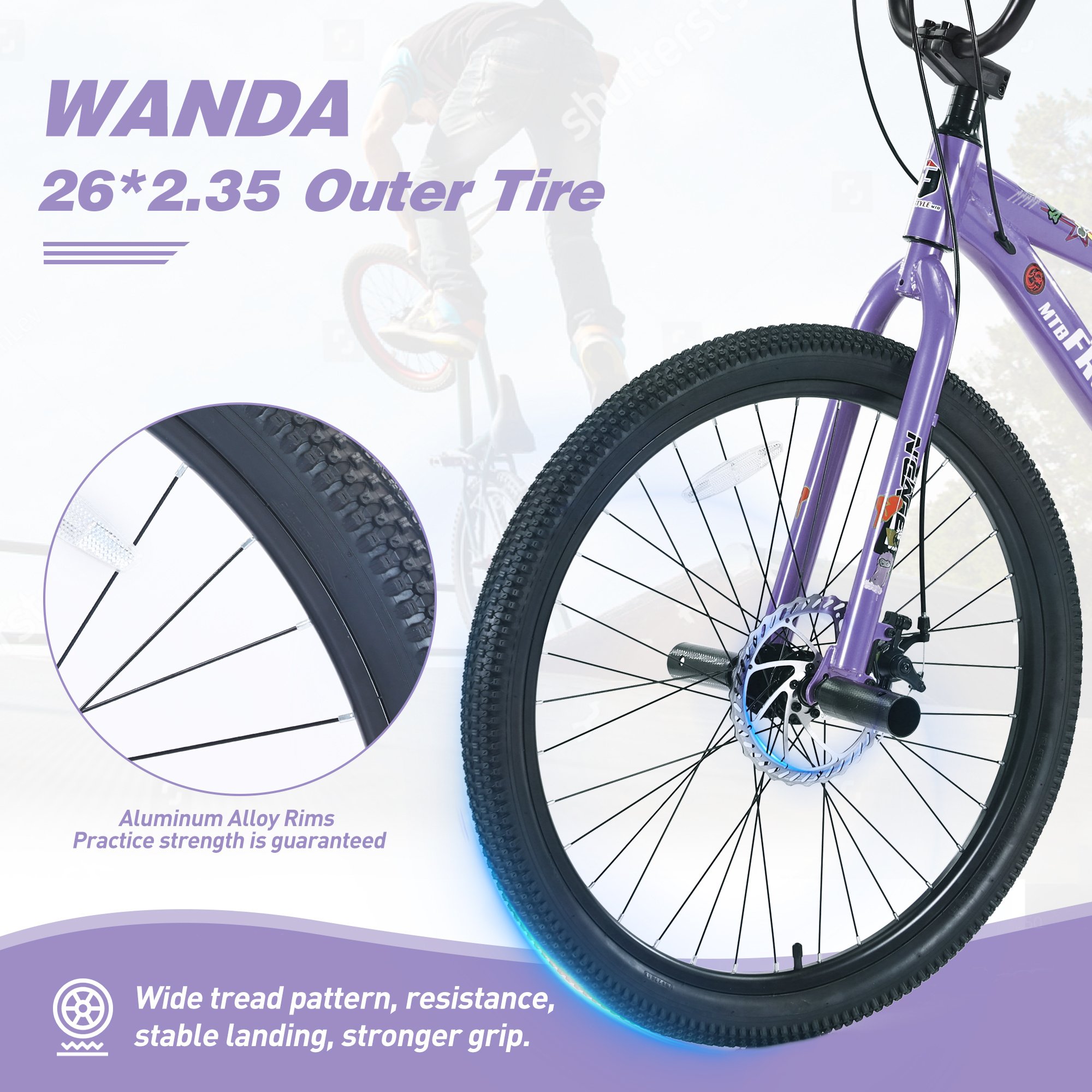 Bike TypeFreestyle MTBAge Range (Description)12+Number of SpeedShimano 7 SpeedColorPurpleWheel Size26 InchFrame MaterialSteel FrameSuspension TypeNOFrame Size15 inch FrameBrakesDouble Disc brakesTIres26*2.35