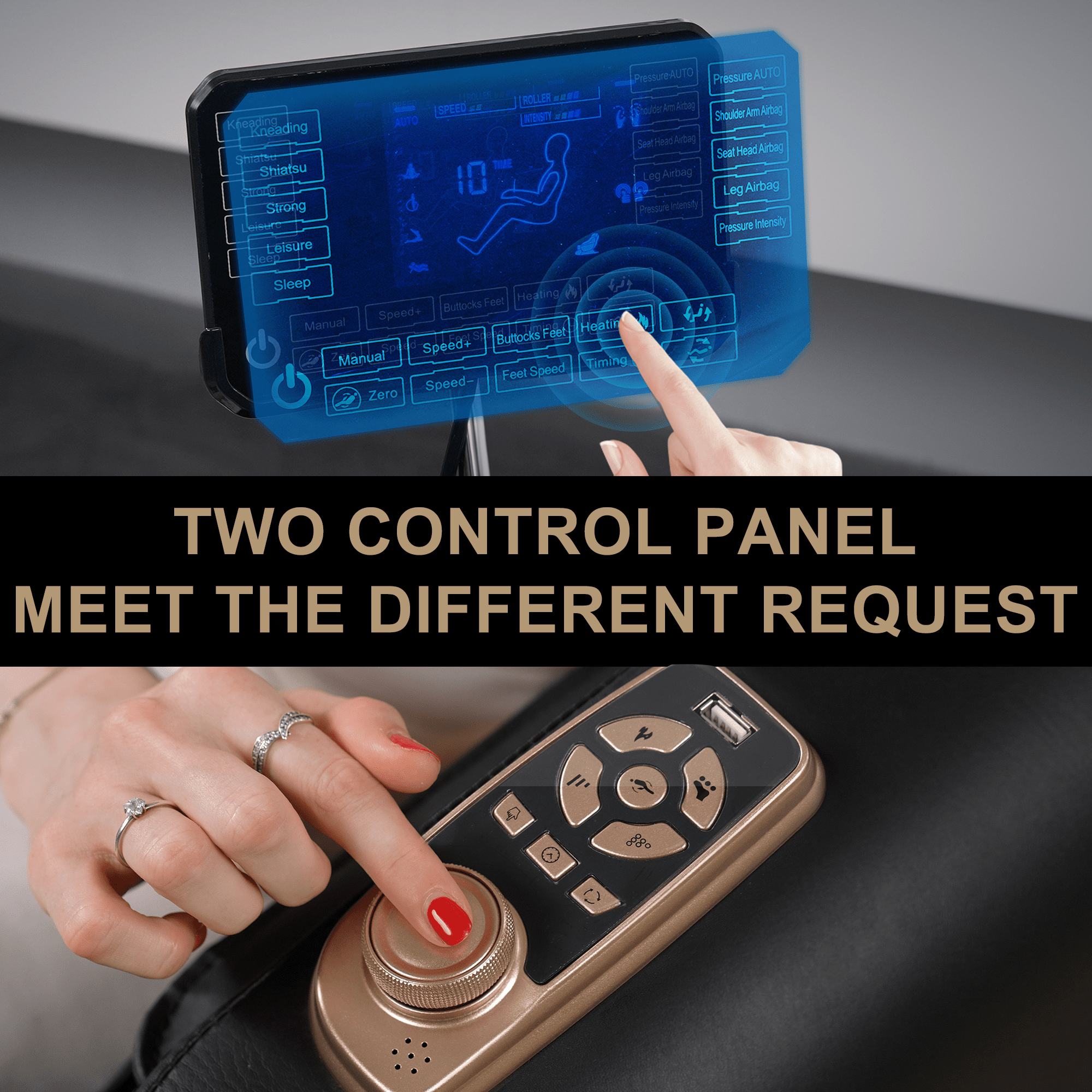 Two Control Panel: Smart large screen & Rotary switch,meet the different request.It smoothly and securely controls the rise and fall without leaving the massage recliner,staying in your recliner and massage chair,Help you relax better in the massage chair.
