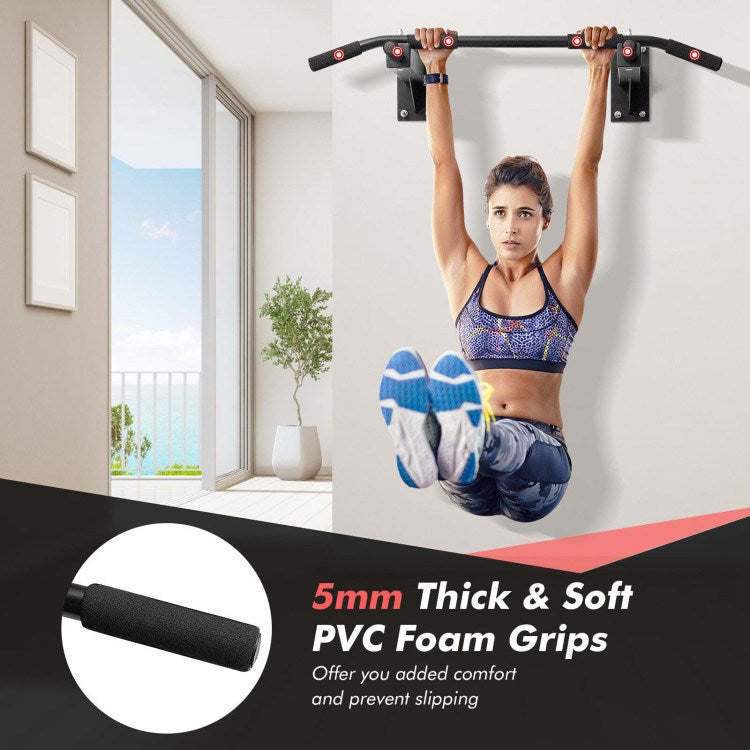 This multi-grip pull up bar can meet different workout needs and maximize full body workout. You can perform various exercises to strengthen the entire upper body and lower body; like pull-ups; dips; leg raises; knee raises and more. Made of thickened and powder-coated steel tubes; this wall mounted chin up bar ensures great stability and long-lasting use. Besides; the reinforced triangular structure and widened plate base enhance overall stability and load capacity (440lbs). Thick and soft foam covered handgrips bring added comfort to your hands and prevent slipping caused by sweat during your workout time. Thanks to the multifunctional and space-saving wall mount design; this full body workout pull up bar is the perfect accessory for your home gym. Please note: it is suitable to mount this pull up bar on a concrete brick/solid cement wall/solid red brick wall/solid tile wall.