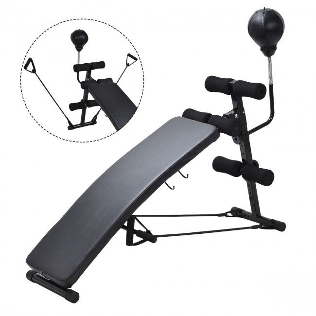 It features a heavy-duty steel frame that is multi-height adjustable. The cushioned seat protects you from overexertion. The bench also has dual ankle pads with non-slip rubber end caps, and an anti-stress speed punching ball.