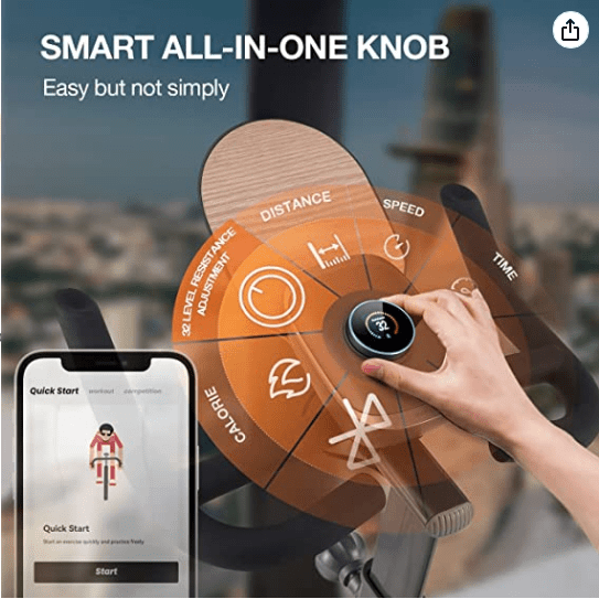 1.Intelligent One-touch Control - This stationary bike is equipped with a multi-functional smart control knob. Tapping the knob to turn on Bluetooth and the cycling bike will connect to your smartphone or tablet in seconds. The LCD screen on the knob will display the resistance level in real-time. Thi