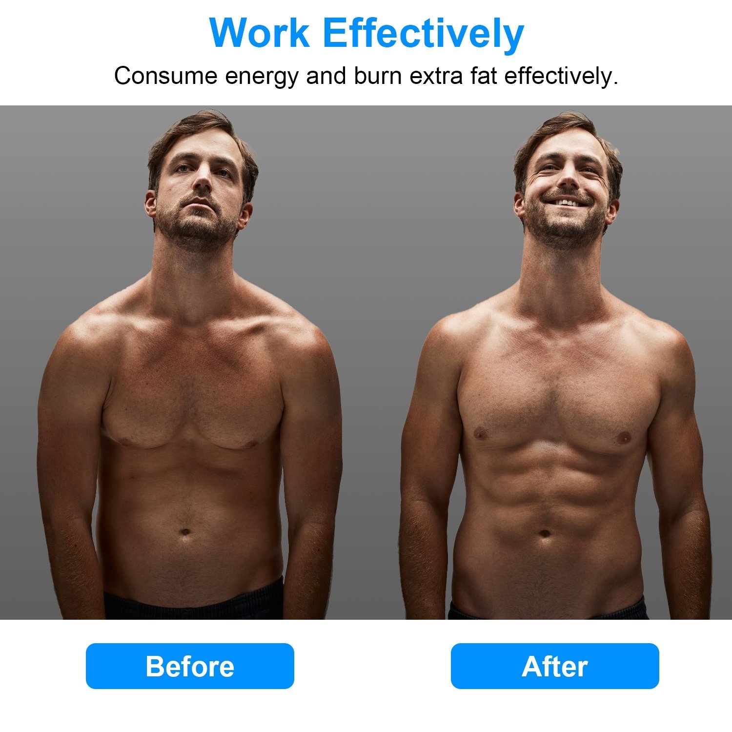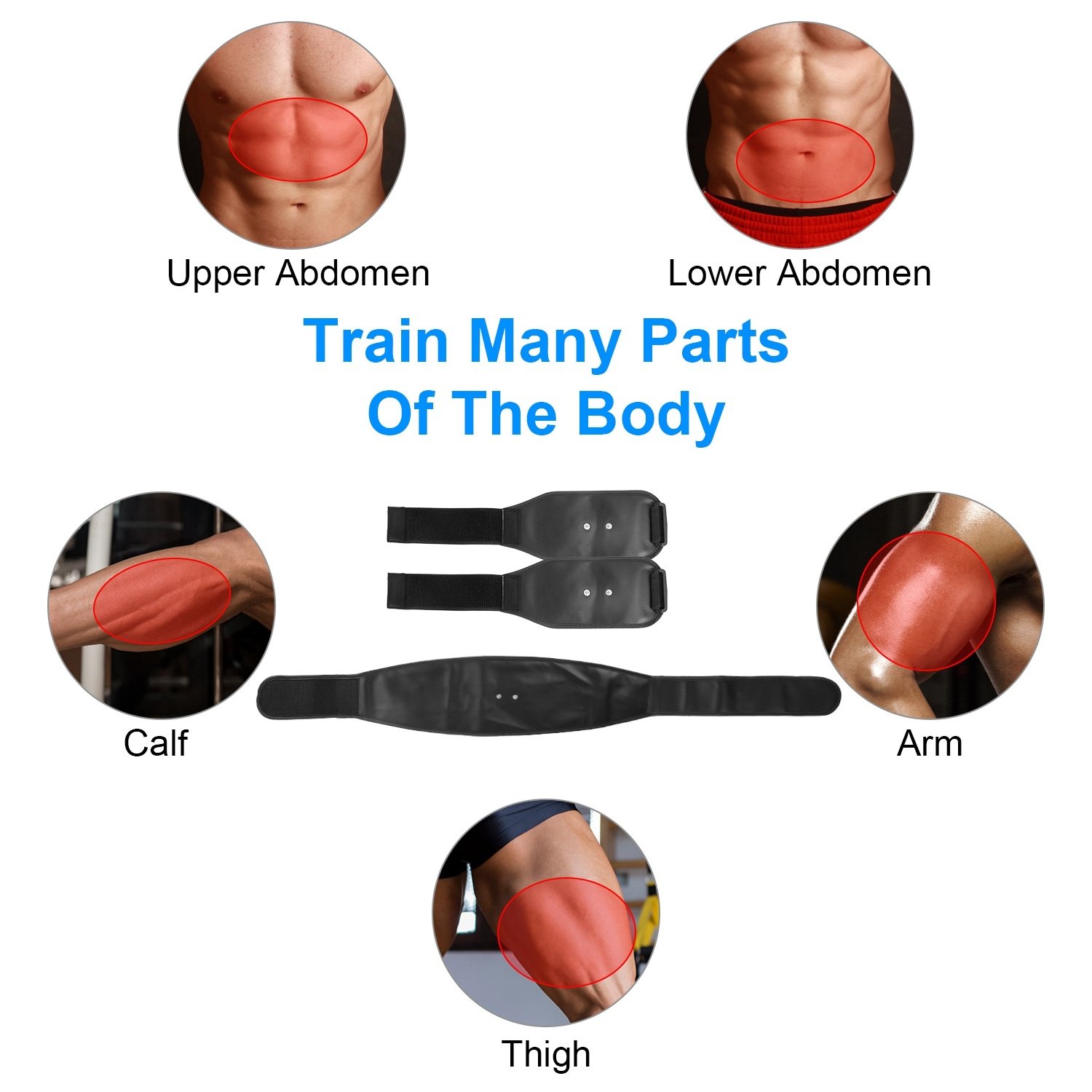 *How It Works*:With 6 conductive areas for Abs belt and 2 conductive areas for per arm belt,the muscle stimulator works by sending electronic pulses to the muscle needing treatment,which promotes the muscles to complete the contraction movement. It's specially designed to consume energy and burn extra fat, so that you will get slimmer and stronger. No more long hours in the gym, and you are going to see good results in no more than 3 months!