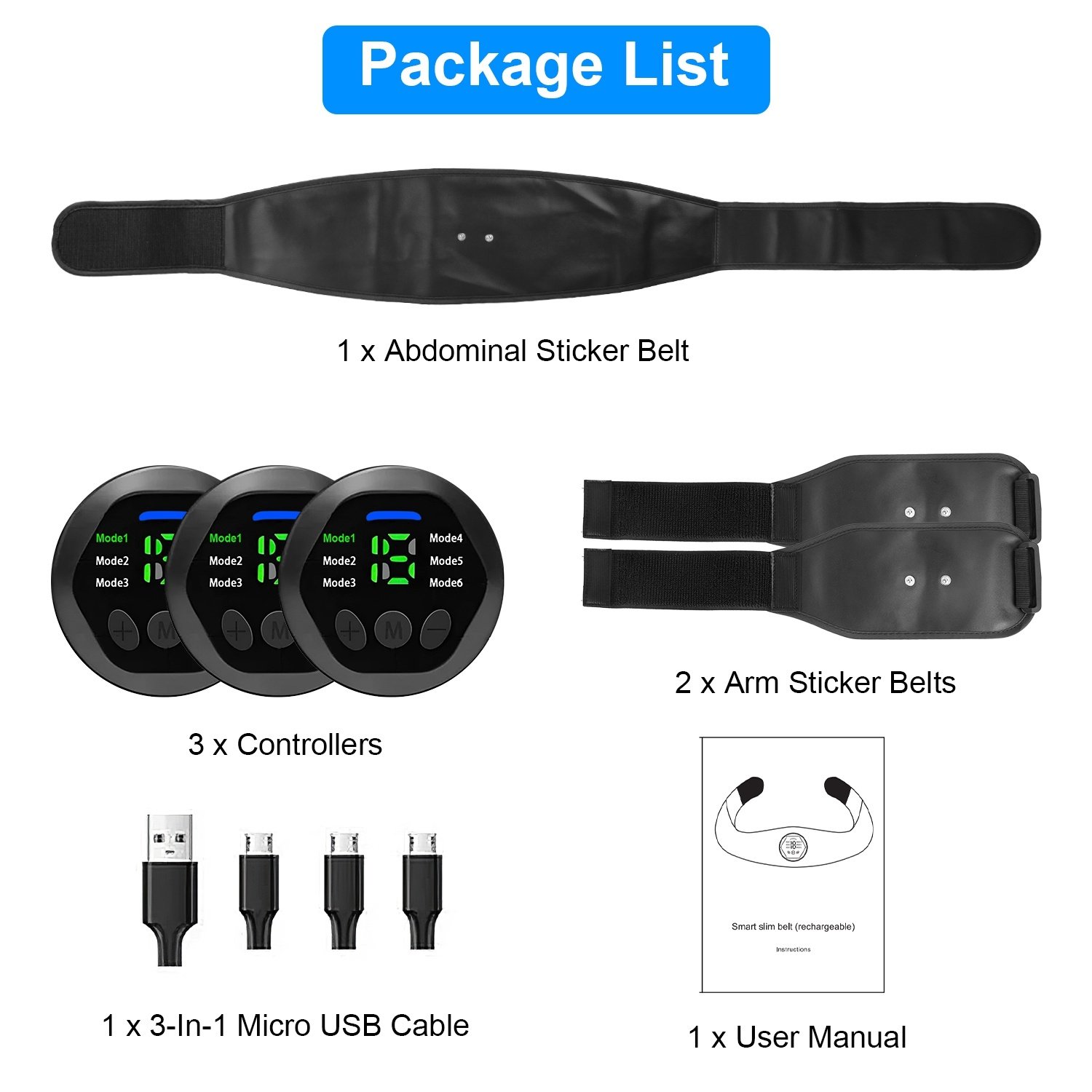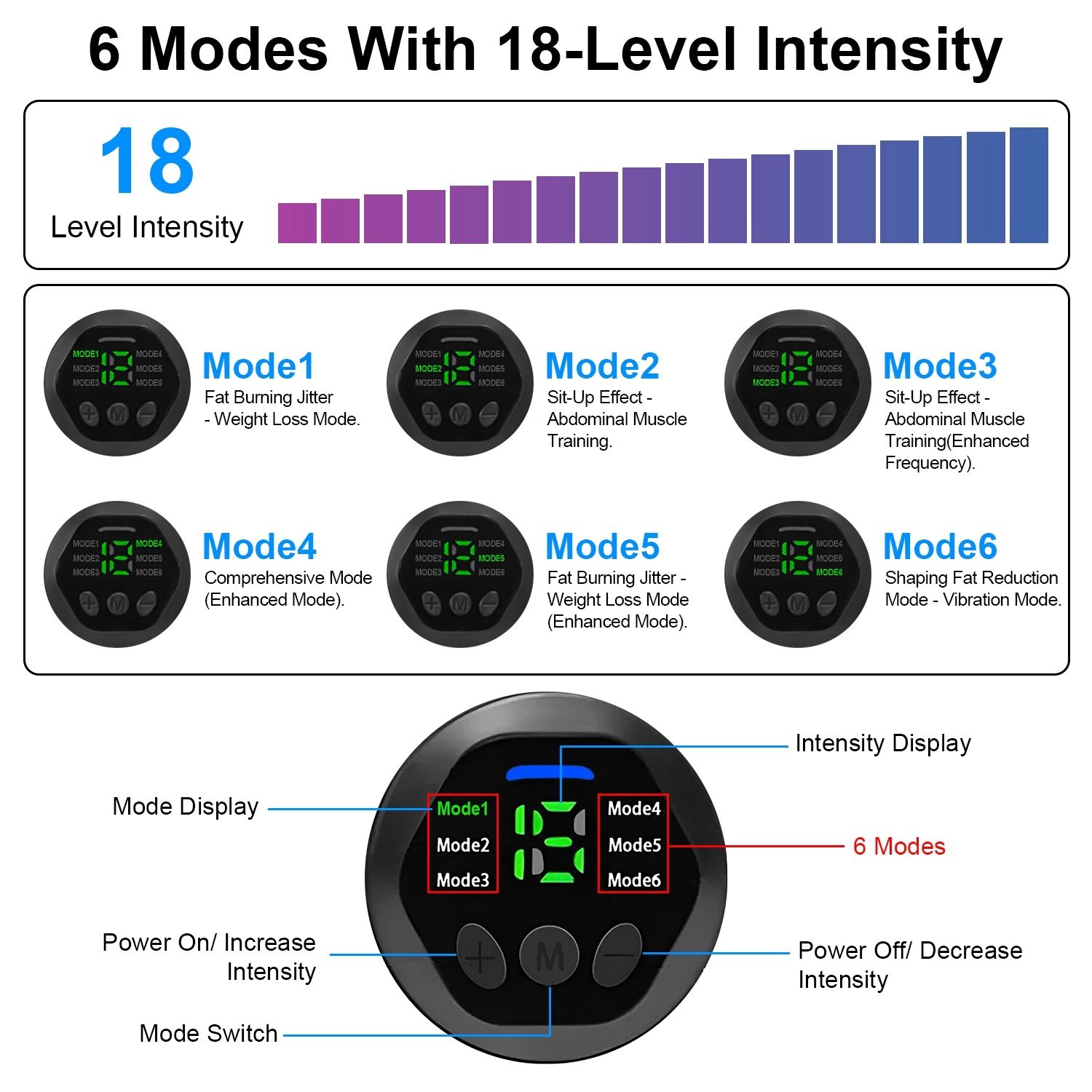 * 6 Modes With 18 Intensity Levels*: Equipped with 6 modes and 18 intensity levels, the Abs trainer allows you to adjust it to different modes and intensity that fit you well to train your muscle. Just snap the abdomen belt on your abs and waist and put the two arm belts anywhere you want to start using.