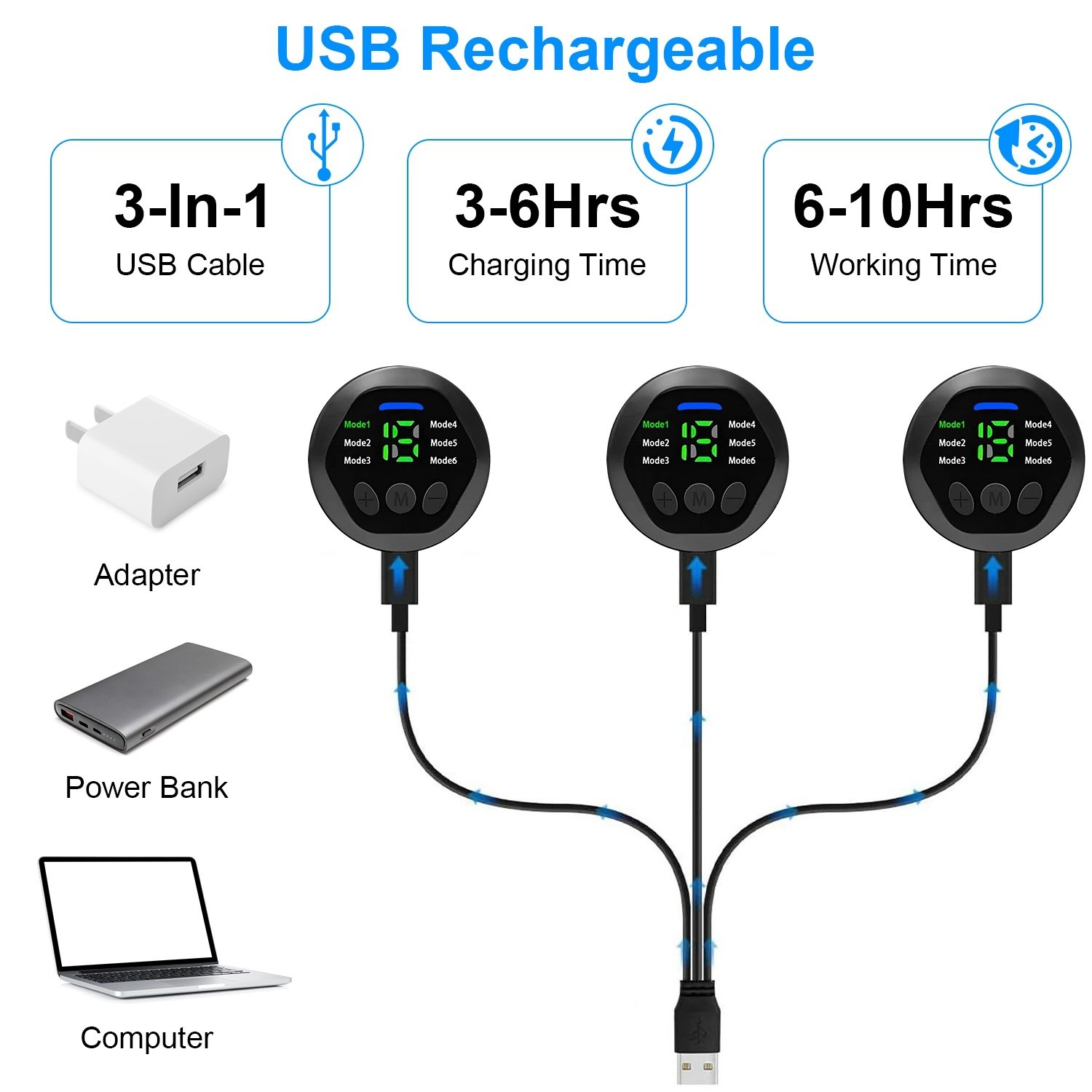 *USB Rechargeable & LCD Display*:Built-in 150mAh battery for each controller and come with 1pc 3-in-1 USB cable,the controller can be fully charged by computer,power bank or adapter about 3-4 hours and use for 6-10 hours. LCD display can show the current mode and intensity level clearly.