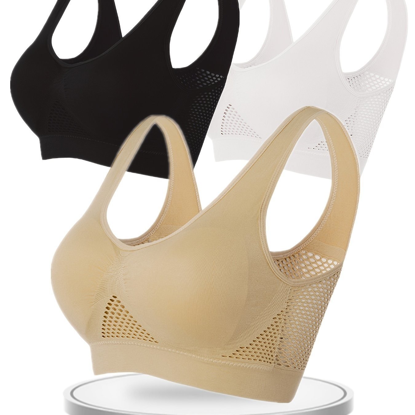 3 Pcs Breathable Solid Eyelet Mesh Hole Vest Sports Bras, Plus Size Non-steel Running Yoga Bras, Women's Lingerie & Underwear