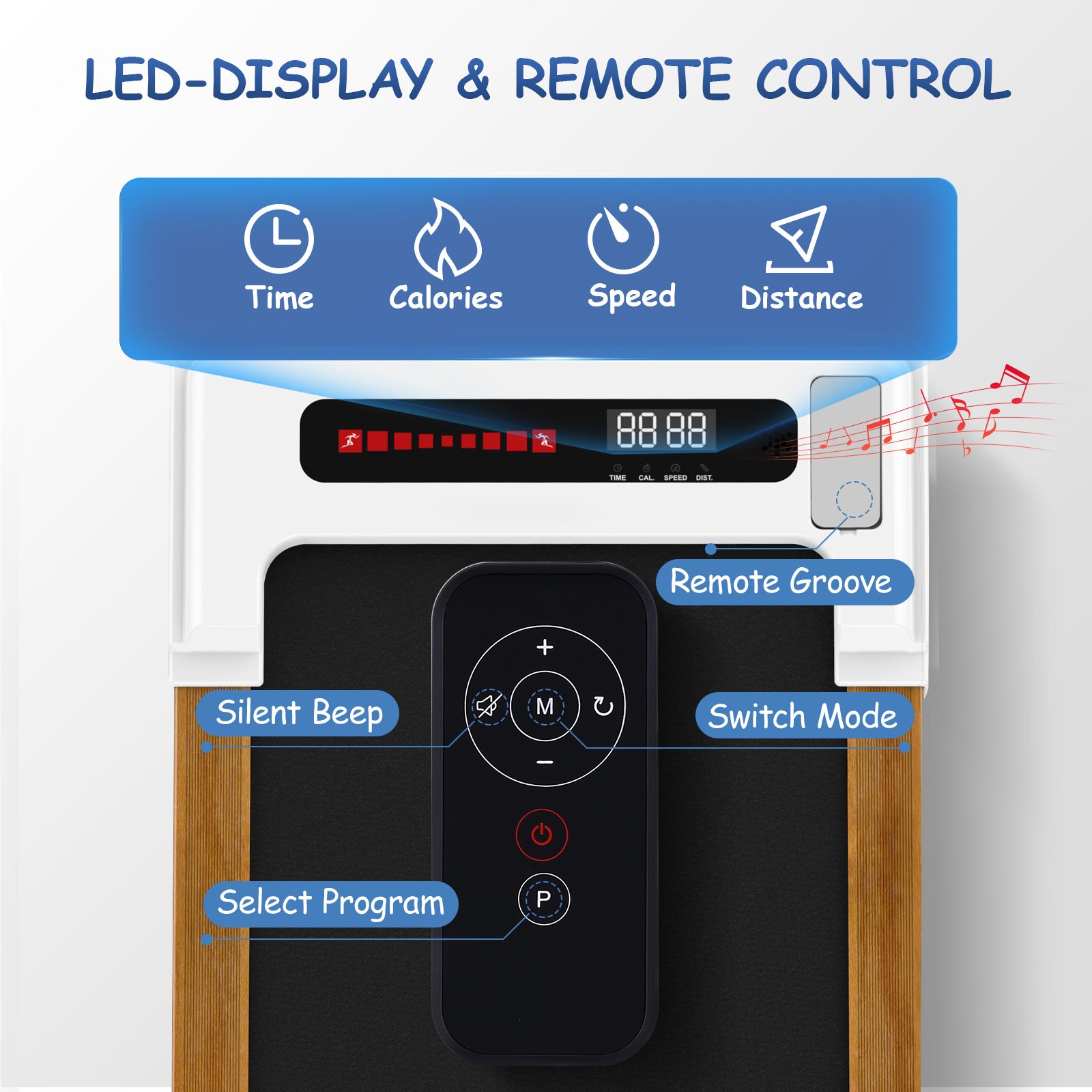 4.The LED Display & Remote Control: This portable treadmill with LED display allows you to track speed, distance, time and calories in real time, The remote control is convenient for you to adjust the speed and modes while running.