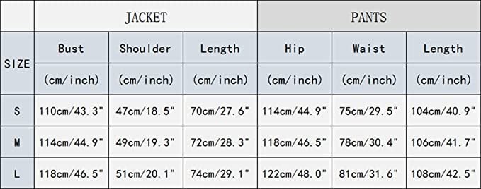 Style: CasualSize Notes:* Size:S:Jacket---Bust:110cm/43.3"-----Shoulder:47cm/18.5"---Length:70cm/27.6"Pants----Waist:75cm/29.5"-----Hip:114cm/43.7"------Length:104cm/40.9"* Size:M:Jacket---Bust:114cm/44.9"-----Shoulder:49cm/19.3"----Length:72cm/28.3"Pants----Waist:78cm/30.4"-----Hip:118cm/46.5"-------Length:106cm/41.7"* Size:L:Jacket---Bust:118cm/46.5"-----Shoulder:51cm/20.1"---Length:74cm/29.1"Pants----Waist:81cm/31.6"-----Hip:122cm/48.0"------Length:110cm/42.5"Delivery:We will ship out your orders within 7 business day by E-packet or other commercial post service. We have Standard Shipping service and Expedited shipping to choose.About Standard Shipping service, the packages will usually take about 7-15 business days to be delivered to you .About Expedited shipping, the packages will usually take about 4-6 business days to be delivered to you .Note1. Please allow 1-2cm differs due to manual measurement.