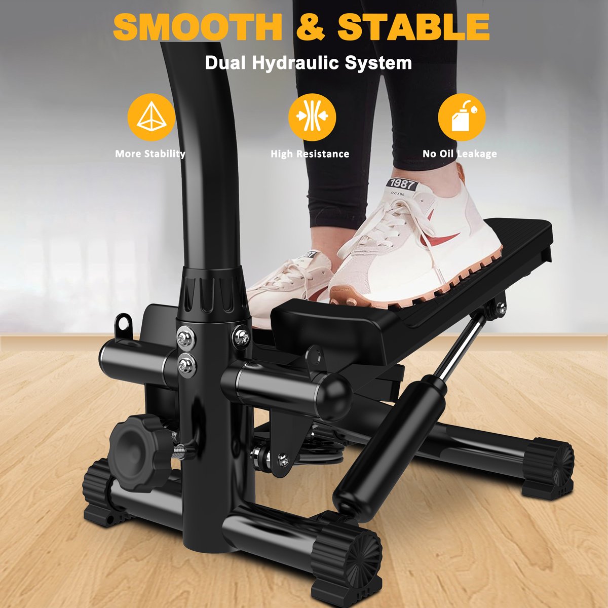 [Quiet Hydraulic Drive System]This mini stair stepper with a handlebar provides a quiet and safe environment. The internal super-energy spring protects the joints and provides a good cushioning effect. Shock Absorb Cushion installed under the pedals, could reduce the movement noise.